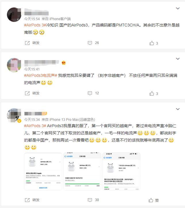 从微博中的网友反馈来看,很多用户表示如果买到了越南版的AirPods 3就马上退货,直到买到“Made in China”为止,也有部分网友和小雷一样如果多次换货都不满意的话就考虑其他家的产品。