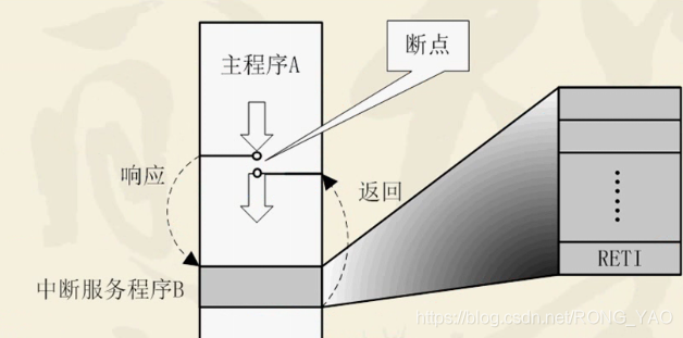 cup暂时中断当前的工作,转去处理事件B(中断响应和中断服务);