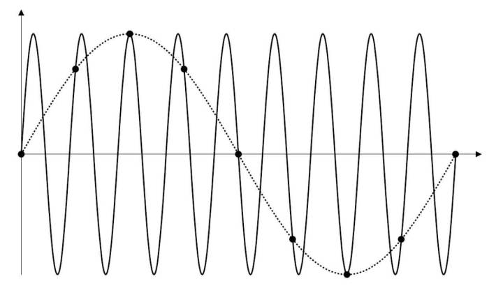 如下图就是采样率不足导致的信号混叠,可以看到采集到的信号和原始信号相比,频率变小了很多。
