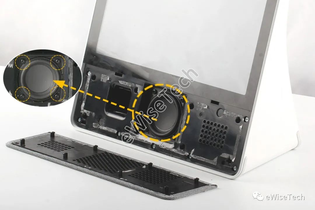 扬声器音腔模块用4颗螺丝固定,音腔四角配有4个塑胶套。音腔后的DC电源接口板用螺丝固定,通过软板与主板连接。音腔外壳表面贴有黑色缓冲减震泡棉胶垫。白色外壳上部有散热孔,贴有防尘网。