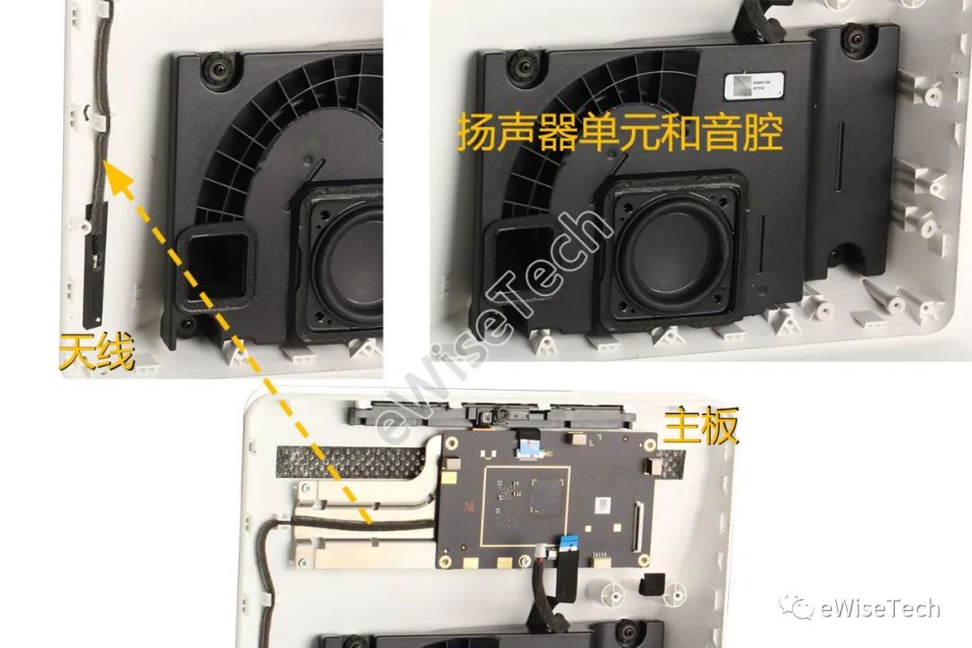 机身上部为主板,下部为音源输出模块(扬声器单元和音腔)。,主机采用FPC天线作为Wi-Fi和蓝牙传输介质。天线软板用双面胶贴在在机身左侧,1根RF同轴线一头焊接在软板上,另一头连接主板,同轴线外用泡棉材料包裹。
