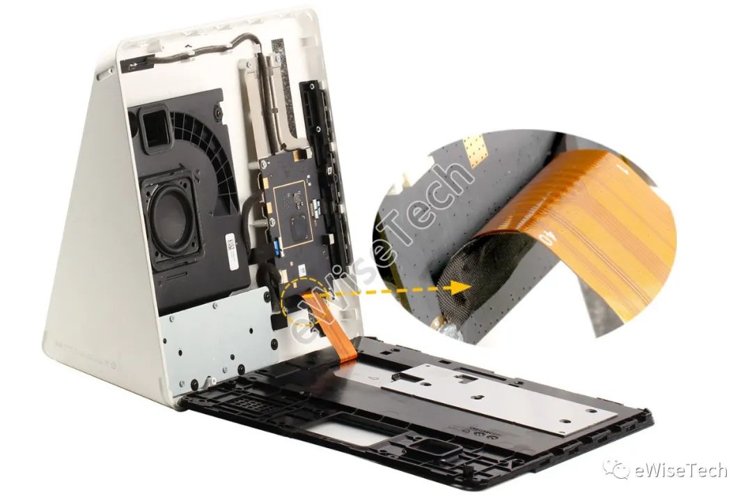 用撬棍沿智慧屏外壳边缘撬开,整个屏幕总成以及塑料中框可一同拆下,屏幕背后连接软板采用ZIF接口连接主板,接口表面用黑色胶布覆盖。