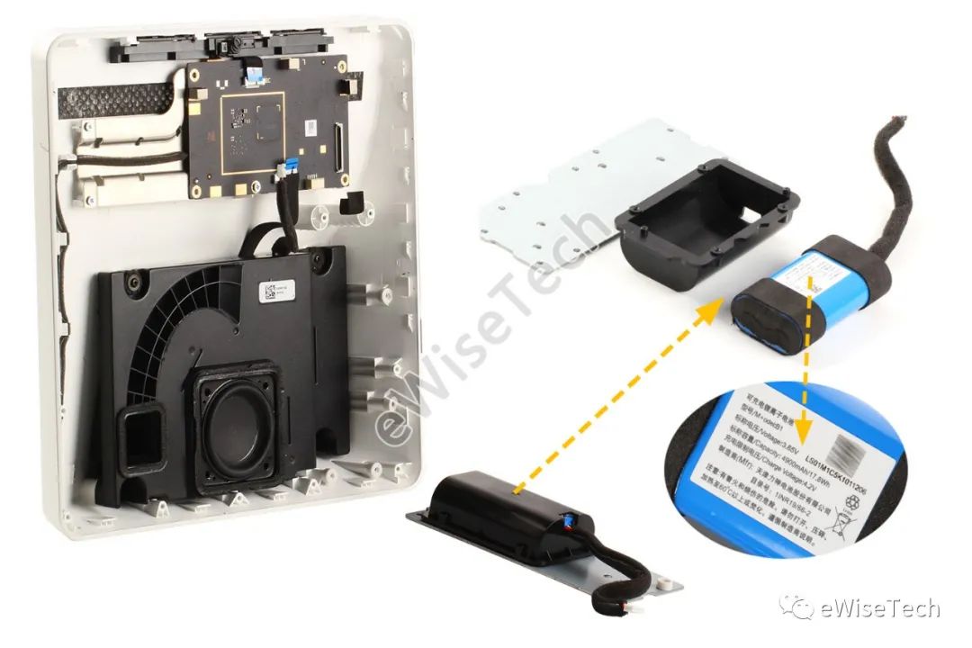 智慧屏内置一块锂离子电池,位于机身右下部,配有塑料电池仓和铝制散热板,通过螺丝固定。4900mAh锂离子电池通过2节18650圆柱形锂电池组成。电池用泡棉胶固定在电池盒内。电池由天津力神电池生产。