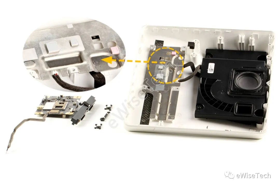 主板及顶部组件可一同取下,主板配有金属散热板,并且中间还使用了4块导热硅胶垫,散热片用螺丝固定在机身上。