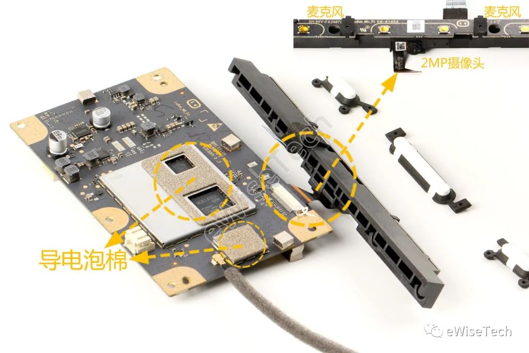 主板正面屏蔽罩表面有2块导电泡棉材料。摄像头软板通过ZIF连接器连接。顶部麦克风、按键主板用双面胶贴在塑料支架上,摄像头用泡棉胶贴合在支架侧面,2颗麦克风配有硅胶拾音套。200万像素前置摄像头采用Omni Vision OV2860 CMOS传感器。