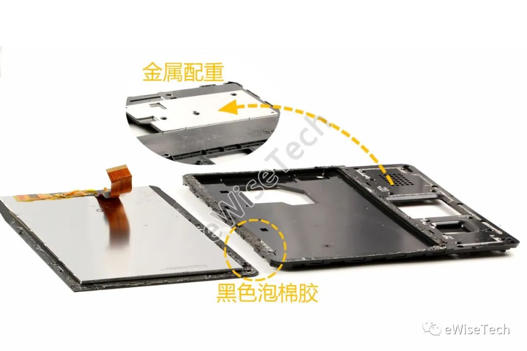 10.1英寸IPS屏幕与ABS底座框架用黑色泡棉胶贴合固定,胶粘性比较强,拆解不太容易。底座背面有一块金属配重用双面胶固定,增加整机重量,增强稳定性同时辅助屏幕散热。