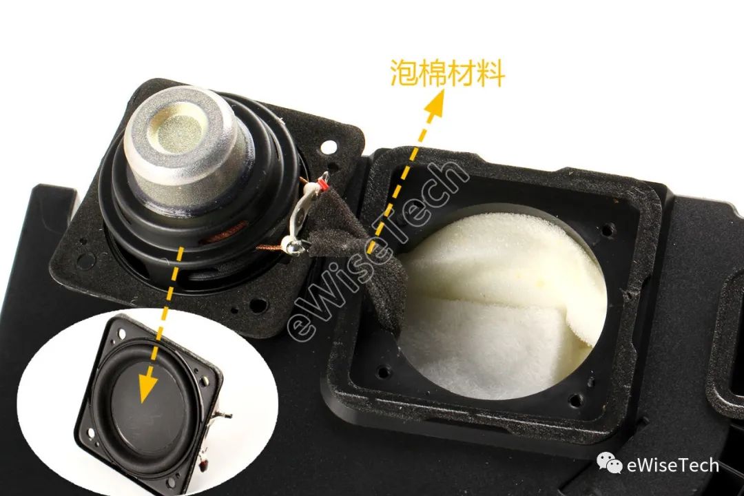 8W扬声器单元。在音腔内有2块白色海绵材料,扬声器连接器穿过音腔顶部小孔与主板连接,连接线外用泡棉材料包裹。