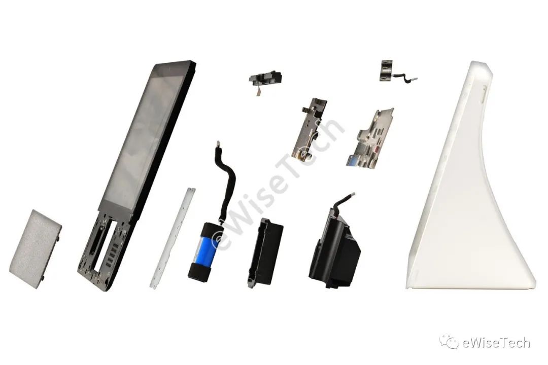 整机采用白色ABS塑料外壳,使用卡扣加螺丝固定各个组件,机身内螺丝柱上配有减震硅胶套,机身内部配有3块金属片分别位于主板背面、电池背面和屏幕底座背面,主要用于增加整机重量增强稳定性同时辅助整机散热。