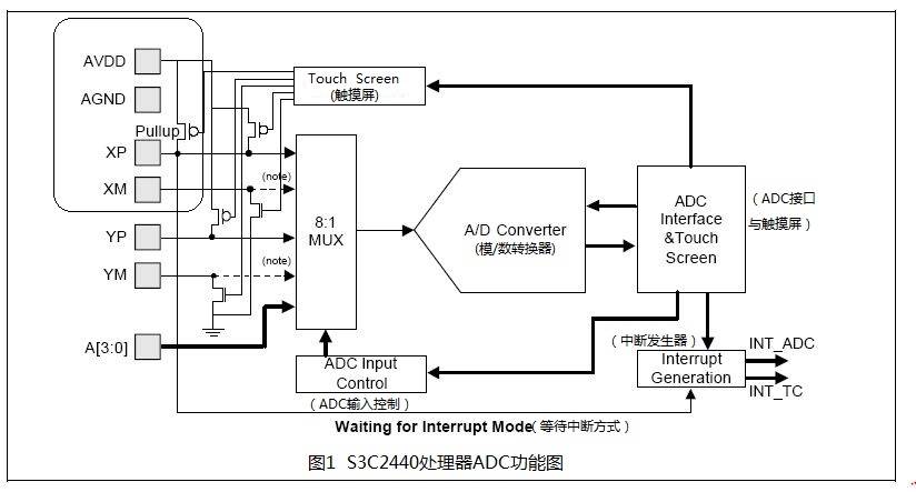S3C2440处理器ADC功能图如图1所示,其中虚线框是与触摸屏有关的功能模块,可以暂不考虑,学完ADC基本实验后,再学触摸屏部分也可以。