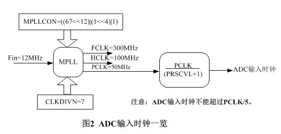 此外还需要注意ADC的输入时钟是如何产生的。对于S3C2440处理器,ADC输入时钟是由PCLK分频得到的,如图2所示