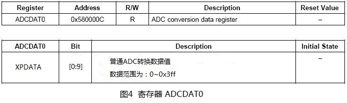 当不使用触摸屏时,与ADC相关的寄存器主要有寄存器ADCCON和寄存器ADCDAT0。寄存器ADCCON主要用于ADC的启动方式、设置ADC转换时钟以及ADC转换结束标志位等,如下图3。寄存器ADCDAT0中存放了ADC转换所得到的的数据,ADC转换结束后,可以通过读该寄存器的值来得到转换结果。