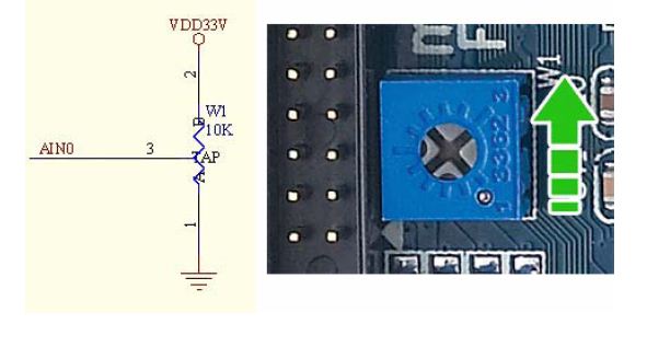 在我的mini2440上有一个可调电位器,如下图所示。电位器的中间抽头部分接在ADC输入通道0上,当电位器滑动头位于最下端时,AIN0引脚电压为0V;当电位器滑动头位于最上端时,AIN0引脚电压为3.3V;当电位器上、下滑动时,AIN0引脚的电压值会在0~3.3V之间变换。因此,本实验使用ADC输入通道0对AIN0引脚电压进行A/D转换。
