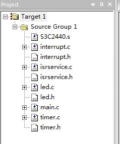 #include /**************************************************** * 函数名称:void Led_Init(void) * 全局变量:无 * 参数说明:无 * 返 回 值;无 * 功 能:设置GPB5-8为输出功能,初始化4个LED灯灭 *****************************************************/ void Led_Init(void) { GPBCON&=~((3<<10)|(3<<12)|(3<<14)|(3<<16)); GPBCON|=((1<<10)|(1<<12)|(1<<14)|(1<<16)); //设置GPB5-8口为输出功能 GPBUP&=~((1<<5)|(1<<6)|(1<<7)|(1<<8)); //上拉电阻使能 GPBDAT|=(1<<5)|(1<<6)|(1<<7)|(1<<8); //令GPBDAT5-8均为高电平,即令4个led灯全灭 } led.h文件 #ifndef __LED_H__ #define __LED_H__ #include #define Led1_On() {GPBDAT&=(~(1<<5));} #define Led1_Off() {GPBDAT|=(1<<5);} #define Led2_On() {GPBDAT&=(~(1<<6));} #define Led2_Off() {GPBDAT|=(1<<6);} #define Led3_On() {GPBDAT&=(~(1<<7));} #define Led3_Off() {GPBDAT|=(1<<7);} #define Led4_On() {GPBDAT&=(~(1<<8));} #define Led4_Off() {GPBDAT|=(1<<8);} /**************************************************** * 函数名称:void Led_Init(void) * 全局变量:无 * 参数说明:无 * 返 回 值;无 * 功 能:设置GPN5-8为输出功能,初始化4个LED灯灭 *****************************************************/ void Led_Init(void); #endif timer.c文件 #include #include"timer.h" /*************************************************************** * 函数名称:void Timer0_Init(void) * 参数说明:无 * 全局变量:无 * 返 回 值:无 * 功 能:对于50MHz的PCLK,经过分频获得62.5KHz的定时器0 * 的输入时钟。 ***************************************************************/ void Timer0_Init(void) { TCFG0&=~(0xff); //设置第1级分频系数,分频系数为99 TCFG0|=99; TCFG1&=~(0xf); //设置第2级分频系数,分频系数为8 TCFG1|=0x02; //62.5KHz=50MHz/(99+1)/8 TCNTB0=62500; //1s中断一次。经过上述分频器得到定时器0的输入时钟频率为62.5kHz,即定时器 //每秒钟计数62500次。因此,初始化时,定时器0计数值初始值为62500 //在这里我们可以看出TCMPBn没有设置,因为咱们用它的默认值0,所以就不需要设置 TCON|=(1<<1); //开启手动更新位,即当定时器开启后,TCMPB0和TCNTB0中的值会加载到寄存器TCMP0和TCNT0中 TCON=0x09; //关闭手动更新位,设置自动加载位,同时开启定时器,这样,TCNT0进行减1计数,当TCNT0中的计 //数值减到0时,TCNTB0、TCMPB0中的数据分别会自动加载到TCNT0、TCMP0中并进行新一轮的减1计数 } timer.h文件 #ifndef __TIMER_H__ #define __TIMER_H__ /*************************************************************** * 函数名称:void Timer0_Init(void) * 参数说明:无 * 全局变量:无 * 返 回 值:无 * 功 能:对于50MHz的PCLK,经过分频获得62.5KHz的定时器0 * 的输入时钟。 ***************************************************************/ void Timer0_Init(void); #endif interrupt.c文件 #include #include"interrupt.h" /**************************************************** * 函数名称:void Timer0_Interrupt_Init(void) * 全局变量:无 * 参数说明:无 * 返 回 值;无 * 功 能:将定时器0中断屏蔽位设为无效 *****************************************************/ void Timer0_Interrupt_Init(void) { INTMSK&=~(1<<10); //将定时器0中断屏蔽位设为无效,这样当 //定时器0发生中断时,中断请求信号可以 } //顺利到达CPU interrupt.h文件 #ifndef __INTERRUPT_H__ #define __INTERRUPT_H__ /**************************************************** * 函数名称:void Timer0_Interrupt_Init(void) * 全局变量:无 * 参数说明:无 * 返 回 值;无 * 功 能:将定时器0中断屏蔽位设为无效 *****************************************************/ void Timer0_Interrupt_Init(void); #endif isrservice.c文件 #include #include"isrservice.h" extern unsigned int flag; //声明外部变量flag,该变量是在main.c文件中定义的 //当1s到来时,中断响应函数将该变量值取反,在主 //程序中通过检测该变量的值来实现不同的操作 /**************************************************** * 函数名称:void __irq IRQ_Handler(void) * 全局变量:无 * 参数说明:无 * 返 回 值;无 * 功 能:定时器0中断服务函数,必须加__irq *****************************************************/ void __irq IRQ_Handler(void) //注意这个函数名字要和S3C2440.s处的跳转标号相同 { flag=!flag; //1s时间到,flag值取反 SRCPND|=1<<10; //清除中断标志位 INTPND|=1<<10; } isrservice.h文件 #ifndef __ISRSERVICE_H__ #define __ISRSERVICE_H__ /**************************************************** * 函数名称:void __irq IRQ_Handler(void) * 全局变量:无 * 参数说明:无 * 返 回 值;无 * 功 能:定时器0中断服务函数,必须加__irq *****************************************************/ void __irq IRQ_Handler(void); #endif 千万要记得下载到nor flash中啊,如果不会,请看博客: http://blog.csdn.net/mybelief321/article/details/8954788