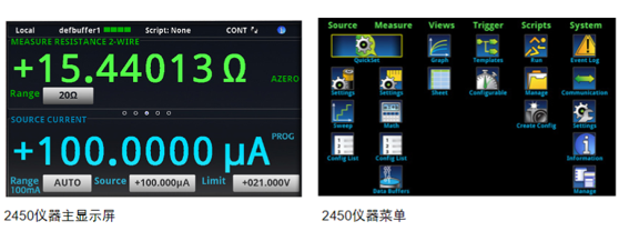 英寸全彩色高分辨率触摸屏界面,易于使用、学习和优化整体速度和效率。简洁的图标化菜单结构能够减少近50%的设置步骤,替代了繁琐的传统按键式、多层次的菜单结构。内建图标化的帮助功能支持直观操作,把手动翻页需求降到最低。这些能力加上其多用途应用,2450型仪器具有天生的易用性,适用于基础与先进测量应用,不论您使用源测量单(SMU)仪器的经验如何。