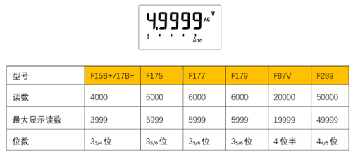 例如Fluke F289,满量程显示读数为49999,即四位半的万用表。