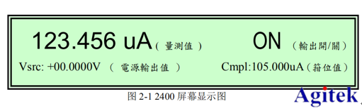 屏幕显示:如图 2-1 所示,屏幕左上方所显示为「量测值」,右上方为「输出开/关」显示,左下方为「电源输出值」,右下方为「箝位值」显示。