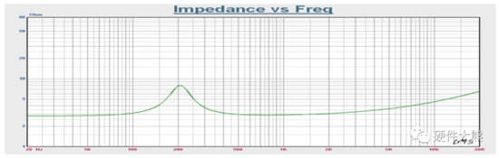 喇叭是一个感性负载元件,对于交流信号而言,它的阻抗是随着频率变化而变化的,其典型的阻抗曲线如下图所示。在谐振峰后面的第一个阻抗最小值即为额定阻抗值。它是计算分频器和放大器输出功率的主要依据。