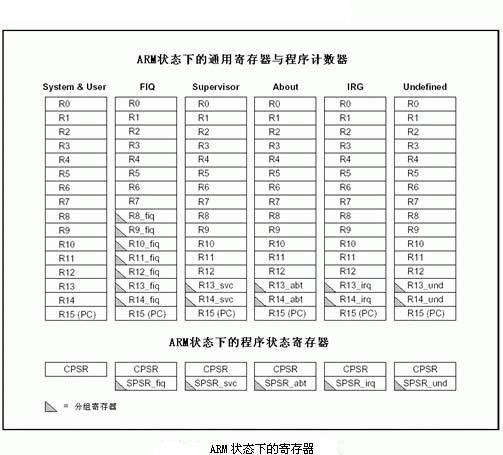 ARM处理器共有7种工作模式,每种工作模式都有对应的寄存器,在程序执行过程中,ARM处理器肯定处于上述7种工作模式的中的一种,在该工作模式下可见的寄存器(即在该模式下可以访问的寄存器)主要有:15个通用寄存器(R0-R14)、程序状态寄存器(CPSR或者SPSR)、程序计数器R15(PC)。由上图可以看出,有些寄存器是各个模式公用的(也就是说,它们是同一个物理寄存器,因此当切换工作模式的时候,要保存这些寄存器的值),如R0-R7,有些寄存器是各个模式独自拥有的物理寄存器(如上图标黑色三角号的寄存器)。