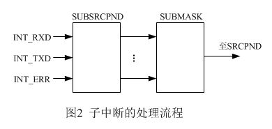 ● Request sources(whith sub-register)主要处理以下类型的中断。例如,串口UART,UART中断包括发送中断、接收中断和因错误而产生的中断,但是这三个中断都属于一个大类,即都属于UART中断。如下图2所示展示了这类子中断的处理流程。当UART发送中断产生时,SUBSCPND寄存器中响应的位会置1,如果INTSUBMSK中不对其进行屏蔽,则SRCPND中的UART中断会置1。