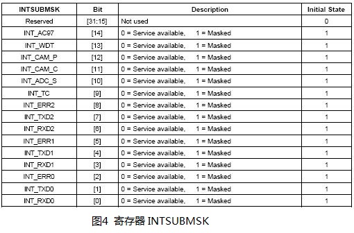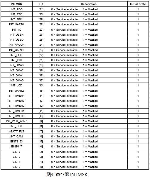 寄存器INTMSK共32位,每一位对应一种类型的中断,当向该位写1时,就可以将中断屏蔽,如图3所示。因此,要屏蔽UART0中断,只需要向寄存器INTMSK的第28位写1即可。