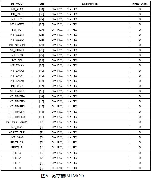 寄存器INTMOD是中断模式寄存器,S3C2440处理器的中断分为一般的中断IRQ和快速中断FIQ,INTMOD寄存器的各位含义如图5所示。当INTMODE中某一位置1时,该位对应的中断被配置为快速中断模式。INTMOD如果不进行初始化,那么所有的中断默认的都是IRQ模式。