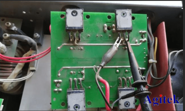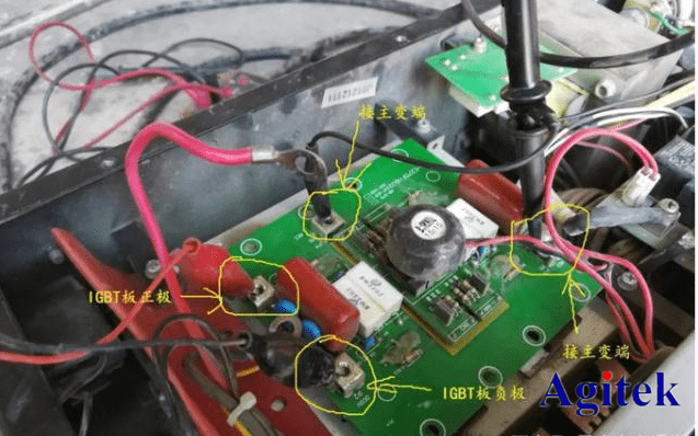 给IGBT板主电输出端供一个30V直流电,正极接IGBT板正极,负极接IGBT板负极,示波器两端分别接IGBT板的两个主变接入端,焊机开机,打到手工焊,看看示波器的波形。
