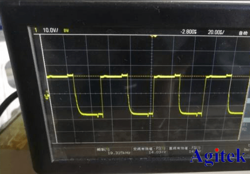 正常情况下应该为方方正正的方波,这个波形缺了一角,说明IGBT管4个管子其中有个坏的,我们换掉后再来看看波形,波形显示正常了,说明问题已解决。