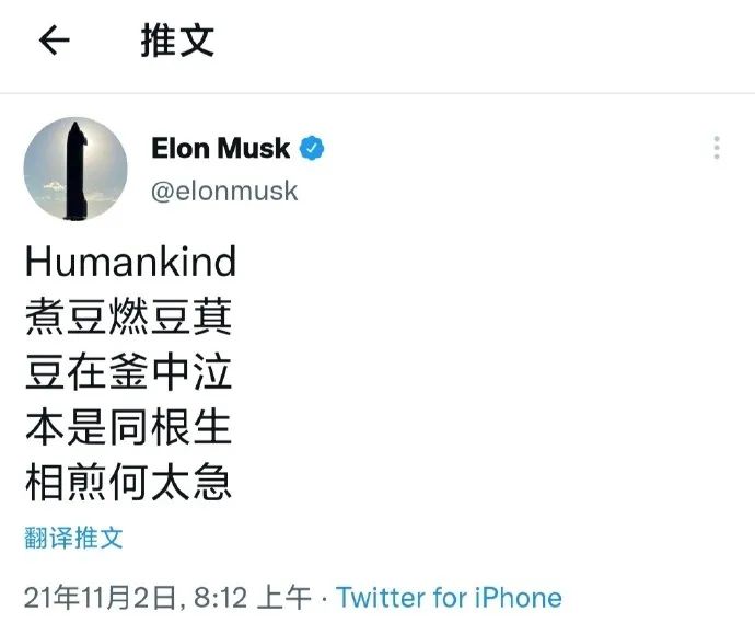 至于缘由,还是他在个人社交平台上,罕见地发布了一条中文推特,内容为中国诗人曹植所写的《七步诗》:煮豆燃豆萁,豆在釜中泣。本是同根生,相煎何太急。最终,累计收获18万的点赞,评论也高达3.5万。