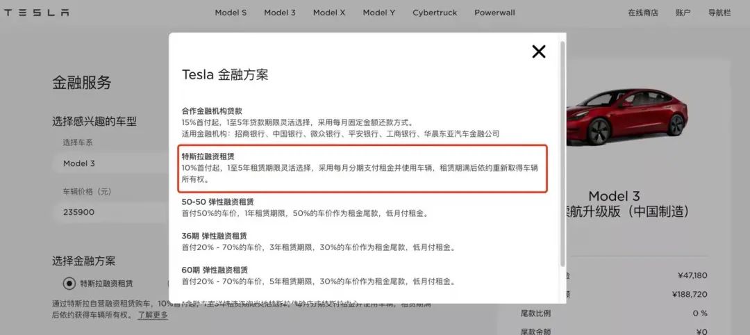 与之类似,就在近日特斯拉中国官网正式上线全新金融服务政策,消费者可以通过零首付的融资租赁模式购买车辆。