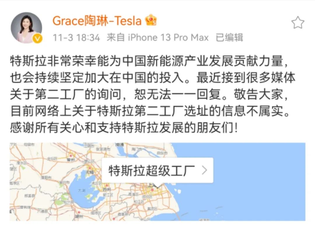 “特斯拉非常荣幸能为中国新能源产业发展贡献力量,也会持续坚定加大在中国的投入。最近接到很多媒体关于第二工厂的询问,恕无法一一回复。敬告大家,目前网络上关于特斯拉第二工厂选址的信息不属实。感谢所有关心和支持特斯拉发展的朋友们。”