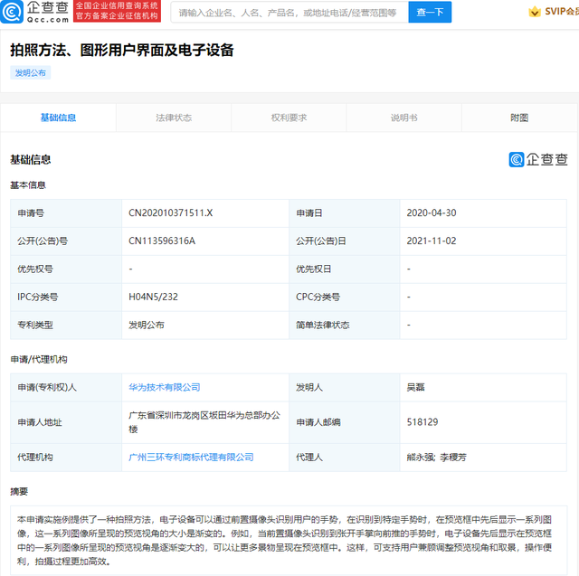 企查查专利摘要显示,如当前置摄像头识别到张开手掌向前推的手势时,电子设备先后显示在预览框中的一系列图像所呈现的预览视角是逐渐变大的,可以让更多景物呈现在预览框中。这样,可支持用户兼顾调整预览视角和取景,操作便利,拍摄过程更加高效。