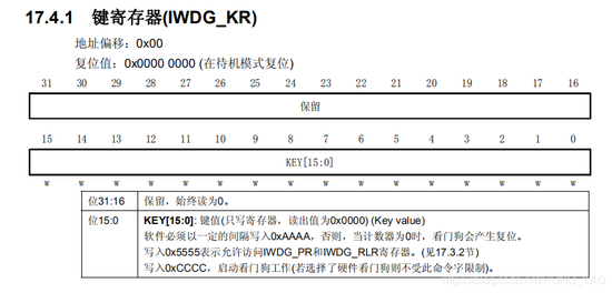 IWDG->KR = IWDG_WriteAccess; IWDG的KR(健存寄存器) 的0~15位写入0x5555 (0101 0101 0101 0101) 表示允许操作IWDG_PR与IWDG_RLR 即取消寄存器写保护