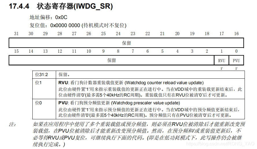 状态寄存器 IWDG_SR 只有位 0: PVU 和位 1: RVU 有效,这两位只能由硬件操作。RVU:看门狗计数器重装载值更新,硬件置 1 表示重装载值的更新正在进行中,更新完毕之后由硬件清 0。 PVU: 看门狗预分频值更新,硬件置 1 表示预分频值的更新正在进行中,当更新完成后,由硬件清 0。所以只有当 RVU/PVU 等于 0 的时候才可以更新重装载寄存器/预分频寄存器