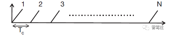 在这种情况下,为了测量速度,雷达系统必须发射两个以上的线性调频脉冲。它发射一组N 个等间隔线性调频脉冲。这组线性调频脉冲称为线性调频脉冲帧。图 7 显示了一个线性调频脉冲帧随时间变化的频率。