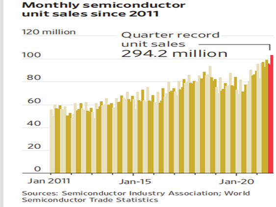 根据Semiconductor Industry Association和World Semiconductor Trade Statistics资料整理的2011年以来的半导体月度单位销售额