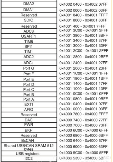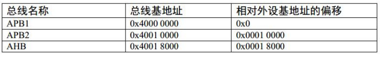 片上外设区分为四条总线,根据外设速度的不同,不同总线挂载着不同的外设,APB1 挂载低速外设,APB2 和 AHB 挂载高速外设。相应总线的最低地址我们称为该总线的基地址,总线基地址也是挂载在该总线上的首个外设的地址。APB1总线的地址最低,因此片上外设就从这这个地址开始,也称外设基地址。