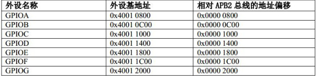 外设 GPIOx 都是挂接在 APB2 总线上的,属于高速的外设。而 APB2 总线的基地址是 0x4001 0000,故 GPIOA 的相对 APB2 总线的地址偏移是800。