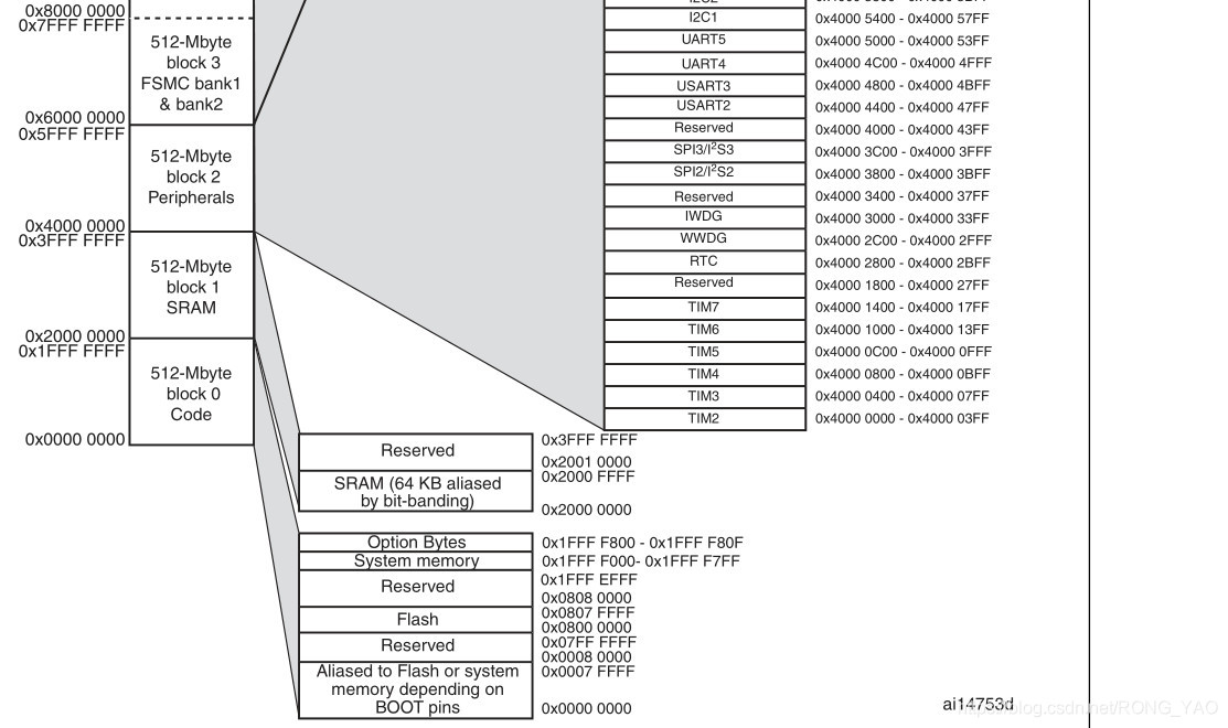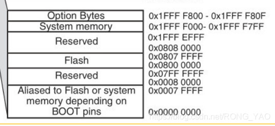 0x0000 0000-0x0007 FFFF:取决于 BOOT 引脚,为 FLASH、系统存储器、SRAM 的别名。