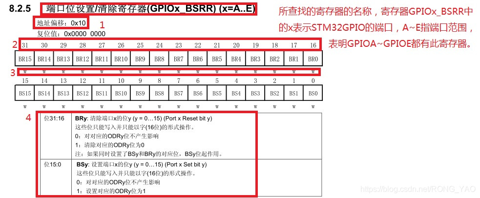 1号红色框表示的是相对 GPIOx 地址的偏移值,比如现在我们使用的是GPIOB 外设,其基地址是 0x4001 0C00,那么本寄存器 GPIOx_BSRR 地址=0x4001 0C00+0x10=0x4001 0C10。对于其他的 GPIO 外设也是一个原理。