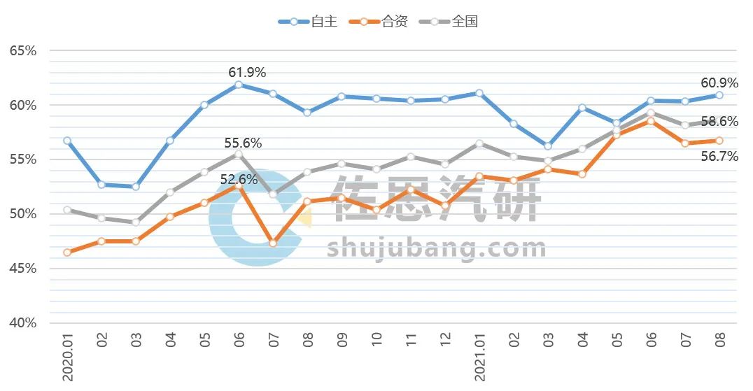 2020-2021年国内自主/合资品牌车联网信息系统装配率月度走势