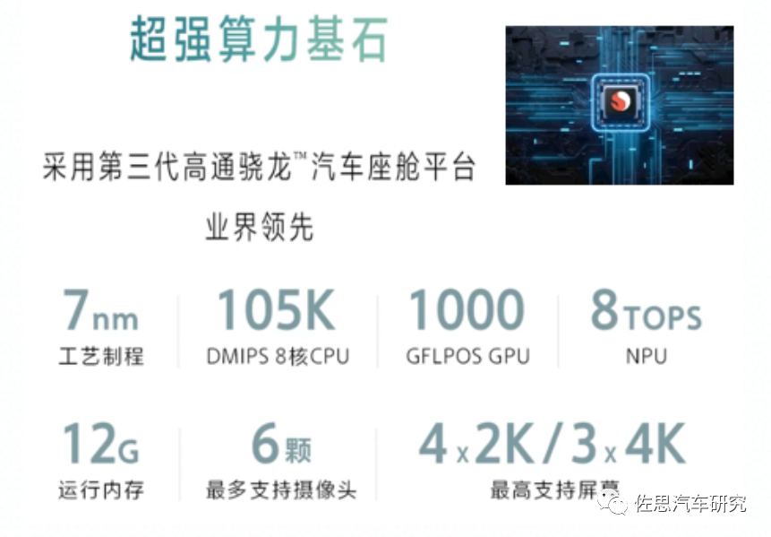星越L :采用亿咖通与吉利联合研发的最新一代车机——吉利银河OS系统,选用高通8155芯片,CPU算力105K DMIPS,GPU算力1000 GFLPOS, NPU达到8 TOPS。