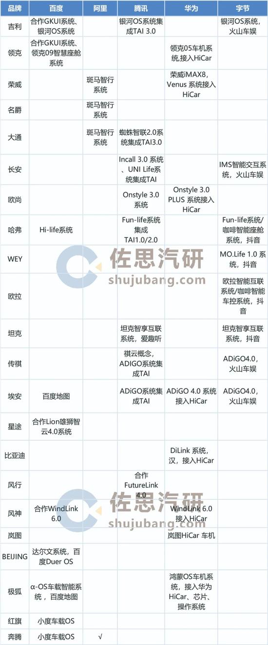 在车载生态领域,自主品牌一直紧密合作BATH (百度、阿里、腾讯、华为),2021年字节系(抖音、西瓜视频、今日头条等)生态也加入进来。