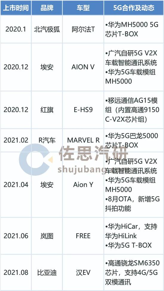 2020-2021年自主品牌已量产5G车型(部分)