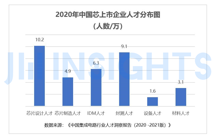 根据集微咨询(JW insights)发布的《中国集成电路行业 人才洞察报告(2020 -2021版)》中显示,从2020年中国芯片上市公司人员构成来看,我国芯片设计业从业人员规模为10.2万人,IDM6.3万人,制造业人才4.9万人,封测人才9.1万人,半导体设备和材料人才分别为1.6万人和3.1万人。