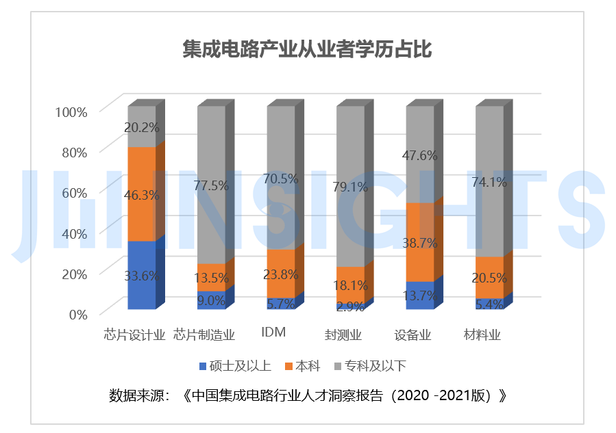根据《中国集成电路行业 人才洞察报告(2020 -2021版)》显示,在硕士及以上学历中,芯片设计业占比最高,达33.6%;半导体设备业占比位第二,占比13.7%;而同样为技术壁垒较高的领域,芯片制造业中的硕士及以上学历占比仅为9%,高学历人才占比近乎芯片设计业的1/4、设备业的2/3,悬殊差距极为巨大。