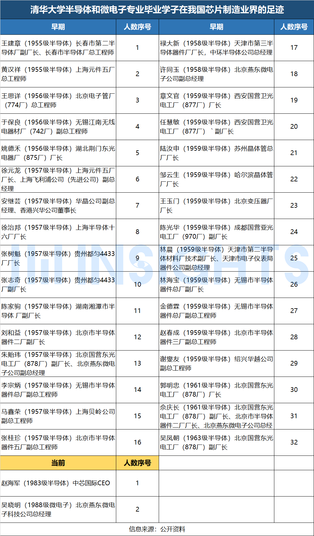 再以芯片制造业的本土人才情况为例,以清华大学为缩影,根据清华毕业的、燕东公司原副总经理朱贻玮前辈梳理的清华大学半导体和微电子专业毕业学子在半导体制造从业者情况,在早期芯片制造领域有大批清华大学的毕业生,而现在只有中芯国际的赵海军和燕东微电子的吴晓明两人。