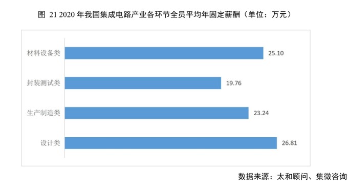 集微咨询(JW insights)研究发现,从2020年我国芯片行业平均年薪来看,从高到底分别为:芯片设计业从业人员平均年薪为26.8万元,材料设备业为25.1万元,制造业为23.2万元,封测业为19.8万元。