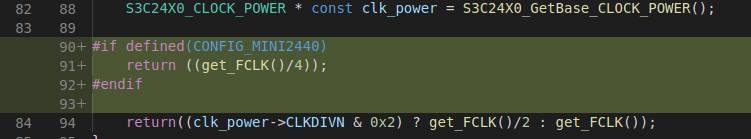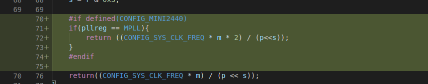 2.5、修改时钟配置,vim cpu/arm920t/s3c24x0/speed.c,添加以下代码: