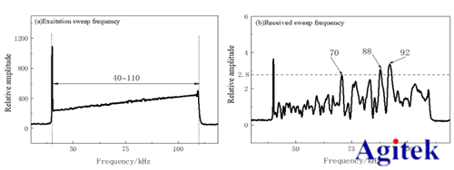 (1)扫频可快速测试元件的频率特性, 通过产生不间断频率连续变化的信号,作用于换能器,获得不同频率下换能器的响应特性。由于超磁致伸缩材料其工作频率不超过100KHz,因此扫频范围为40-100kHz.激励端响应信号幅度随频率逐渐提升呈线性增大。扫频信号通过复合板传播后到达接收端,由图中课件在频率70,80,92kHz处,信号幅值为局部峰值,为换能器的相对优选激励频率。