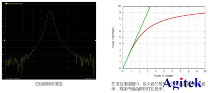 放大器的饱和可在下方右侧图中看到。在输入功率高于 1W 时,实际输出(红色)会偏离理想输出(绿色)。这种现象称为压缩。接收机无法捕获高于其压缩点的任何器件输出的信号。输入功率的这种限制就构成了动态范围的上限。